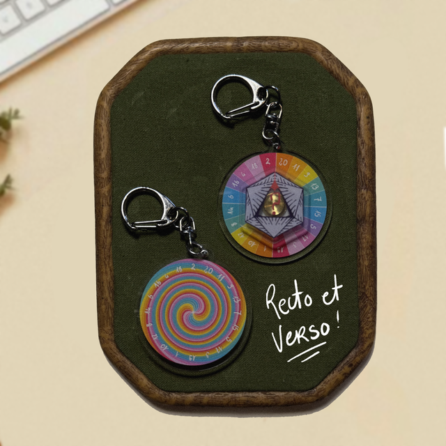 Porte-clés d’un diamètre d’environ 5 cm avec mécanisme rotatif, permettant aux éléments de tourner librement. Pratique et original pour accrocher à un sac ou trousseau.