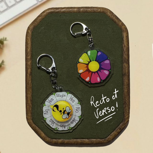 Porte-clés d’un diamètre d’environ 5 cm avec mécanisme rotatif, permettant aux éléments de tourner librement. Pratique et original pour accrocher à un sac ou trousseau.