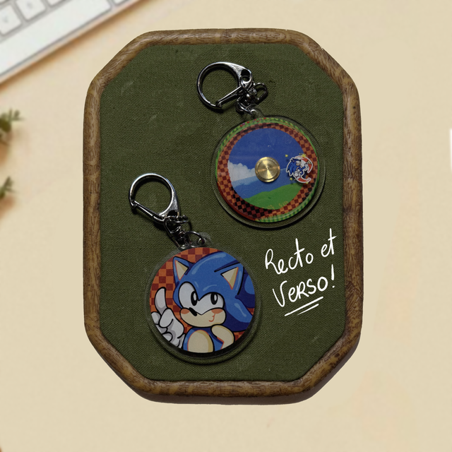 Porte-clés d’un diamètre d’environ 5 cm avec mécanisme rotatif, permettant aux éléments de tourner librement. Pratique et original pour accrocher à un sac ou trousseau.